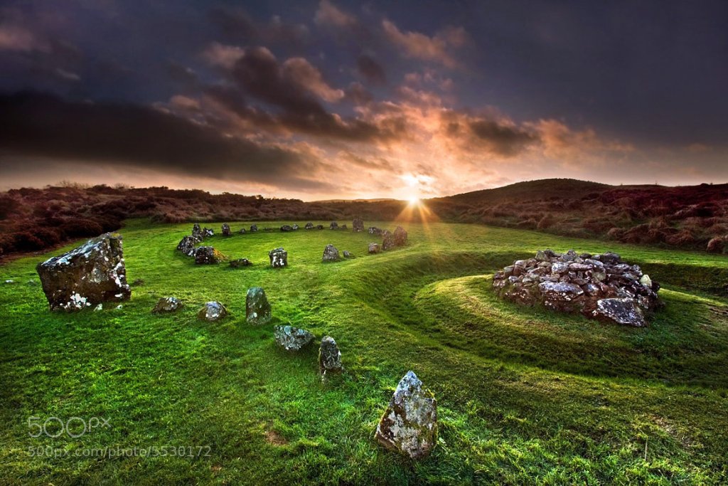 One of the most spectacular of the ancient megalithic monuments in the British isles, far surpassing in size the more well-known Stonehenge. Like Stonehenge, it is located in Wiltshire. Enough of the monument has survived that a picture of what it looked like when it was completed can be reconstructed. The large ritual area is surrounded by a circular earth embankment some 1200 feet in diameter. Immediately inside of the embankment is a ditch, and on the inner edge of the ditch there once stood a circle of some 100 stones; a number of which once formed the western half of the circle remain in place. Inside the large circle were two inner circles, both of approximately 340 feet in diameter. In the center of the circle to the north is a cove, but its purpose is unknown. There was a is surrounded by a circular earth embankment some 1200 feet in diameter. Immediately inside of the embankment is a ditch, and on the inner edge of the ditch there once stood a circle of some 100 stones; a number of which once formed the western half of the circle remain in place. Inside the large circle were two inner circles, both of approximately 340 feet in diameter. In the center of the circle to the north is a cove, but its purpose is unknown. There was a single stone, surrounded by a rectangle of smaller stones, in the center of the southern circle. All of the stones appeared unfinished and were gathered from the surrounding countryside. Similar stones lie scattered on the landscape of the region to this day. Avebury has been inhabited since late Neolithic times. Then, around 2600 B.C.E., the southernmost inner circle was erected, and it appears to have been used for a variety of ritual purposes. The northernmost inner circle was erected soon afterwards. It was quite different in that it had a double ring of stones. It has been suggested that it was possibly used for funeral rites. Next, a ditch was dug around the entire site and the earth taken from the excavation was used to form the rampart like outer circle. A double line of stones, generally called West Kennet Avenue, led from Avebury to the south toward an associated monument about a mile away. There were at one time as many as 200 hundred stones along the avenue, but less than 20 remain today. Avebury probably was completed around 2000 B.C.E. And utilized for more than a millennium. As the megaliths in Britain have been studied, Avebury has been placed in the larger context of sites scattered across the land. It has been studied in light of the alignments its stones might offer to various prominent planetary bodies. Alexander Thom, who pioneered such study, did very accurate measures of the remaining stones, and has suggested they demonstrate a quite sophisticated knowledge of the moon’s movements. Others have noted that so many stones are missing that determining alignments is quite difficult if not impossible. The circles were probably places in which a large number of the people in the surrounding countryside gathered, but their essential functions remain a matter of widespread speculation.